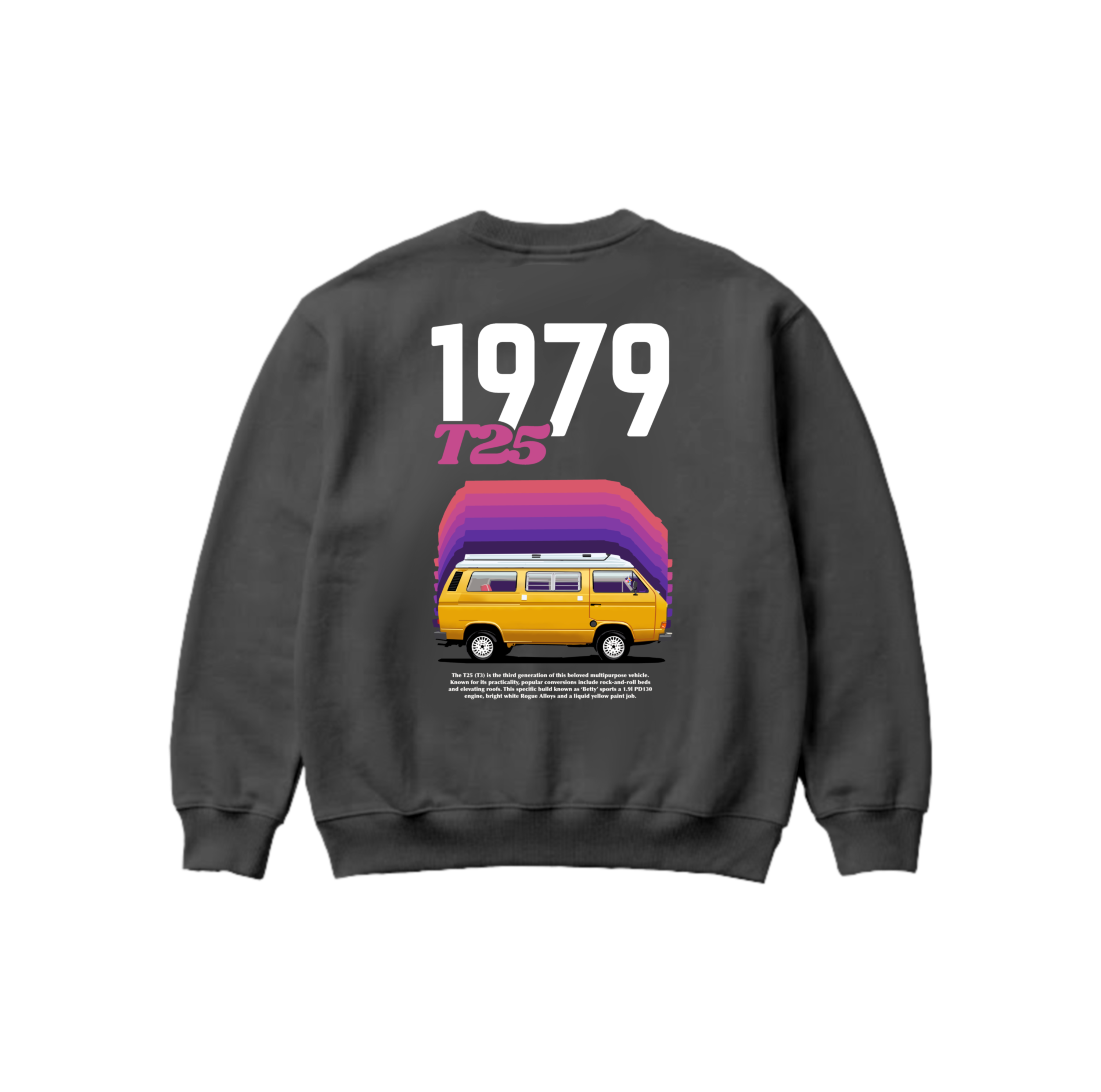 The T25 (T3) is the third generation of this beloved multipurpose vehicle. Known for its practicality, popular conversions include rock-and-roll beds and elevating roofs. This specific build known as "Betty" sports a 1.9l PD130 engine, bright white Rogue alloys and a liquid yellow paint job.